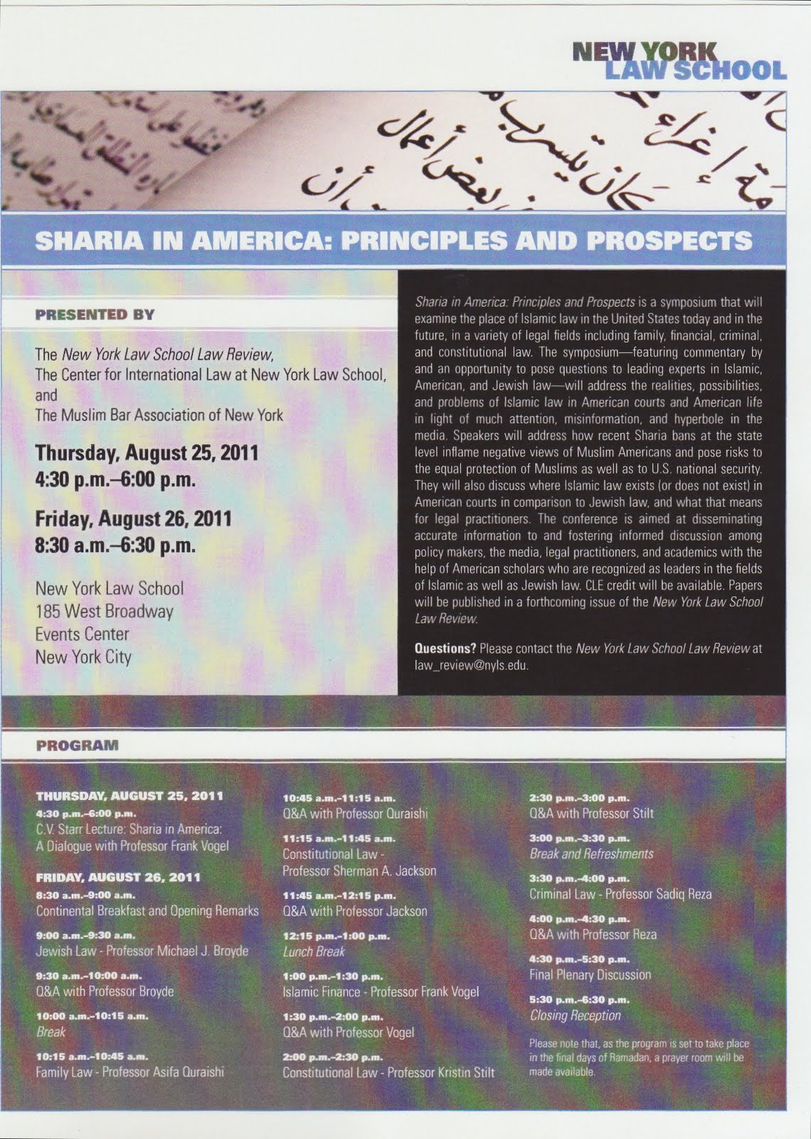 This is Part 1 of 10 audio posts. It was an 8 hour Symposium hosted by NY Law School Law School Review on “Sharia in America:Principle and Prospects” to examine the place of Islamic Law in The United States.