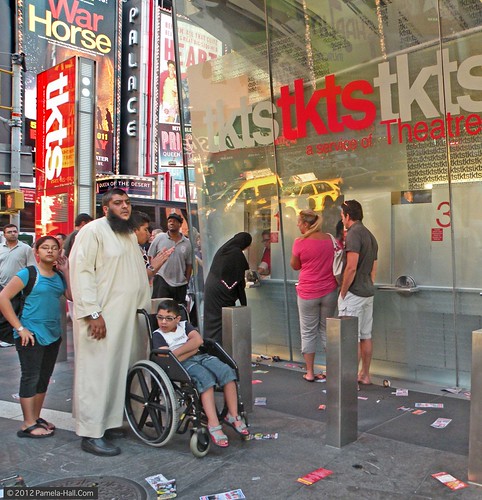 TKTS Booth where tourists buy tickets for Broadway shows. In the background, is a lady in niqab buying tickets for her family.